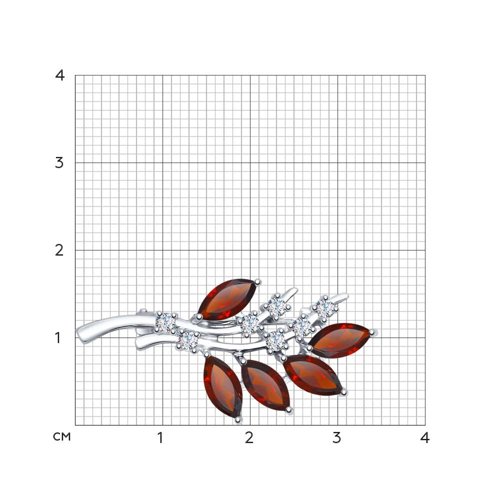 Брошь выполнена из серебра 925 пробы, с родиевым покрытием, украшена гранатами и россыпью сверкающих фианитов.