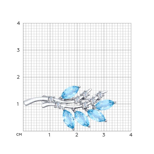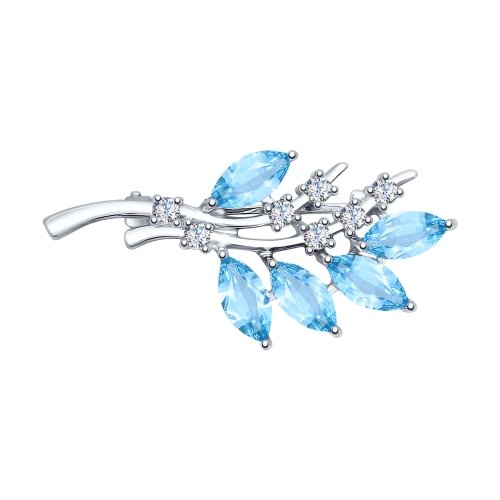 Оригинальная брошь, напоминающая веточку, выполнена из серебра 925 пробы. В роли камней здесь ледяные топазы, которые придают изделию холодного очарования. Изделие покрыто родием, драгоценным металлом платиновой группы, который делает серебро устойчивым к повреждениям, не вызывает аллергии и сохраняет искрящийся блеск.