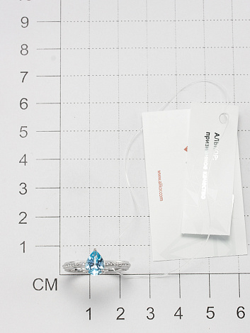 Кольцо с голубым топазом, блеск и красоту которого подчёркивает дорожка кубических циркониев, выполнено из серебра 925 пробы